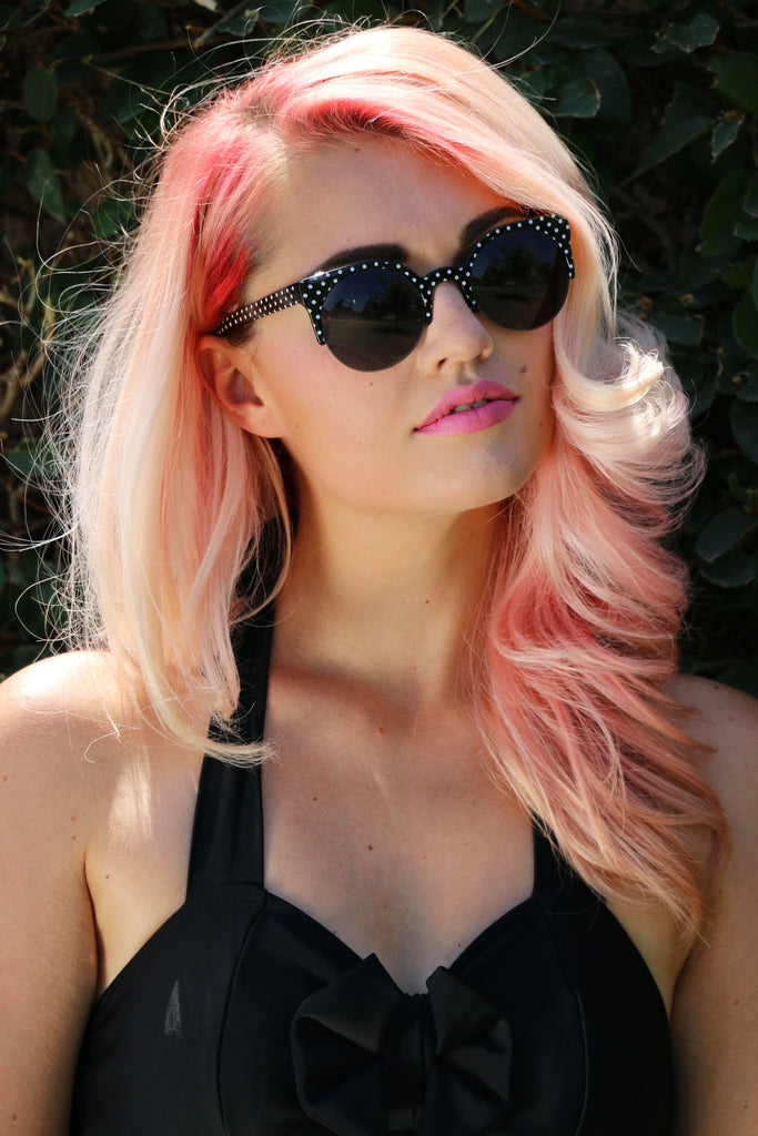 Juliet sunnies feature black with white dot frames and uv protection from Summer rays! Perfect for the ultra girly girl! Imported.