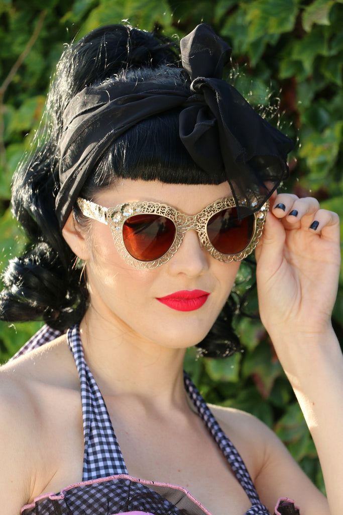 Make a statement with the Lacey Sunnies! Amazing lace detail through out the frame and small metal flowers attached at frame. For a limited time only! Imported.
