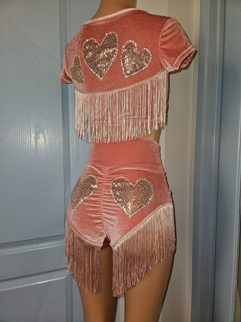 The LONELY HEARTS PINK CROP TOP features sequin heart appliqués on front and back, completed with a mauve fringe for a flirty and fun shimmy. It's sultry mauve pink stretch velvet lycra hue captures attention for a bold, stylish look. Perfect for Spring and Summer!
