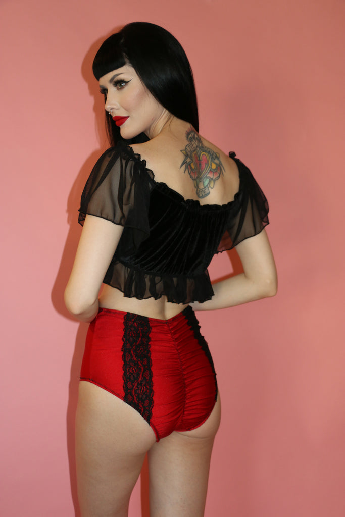 Be sweet! Be mine! In Pillow Talk! This new style is delightful and dainty! Made from black velvet and trimmed with black lace and sheer ruffles and sleeves. This Dreamy style can be worn as lingerie or as a crop top. Sleeves can be worn up or down for a come hither look, wink! wink!
