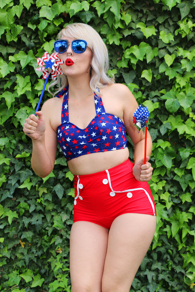 Calling all sailors!! This brand new style for 2017 features a high waisted cut bottom in red, pockets are highlighted with contrasted white binding and trimmed off with white buttons. Fully lined.