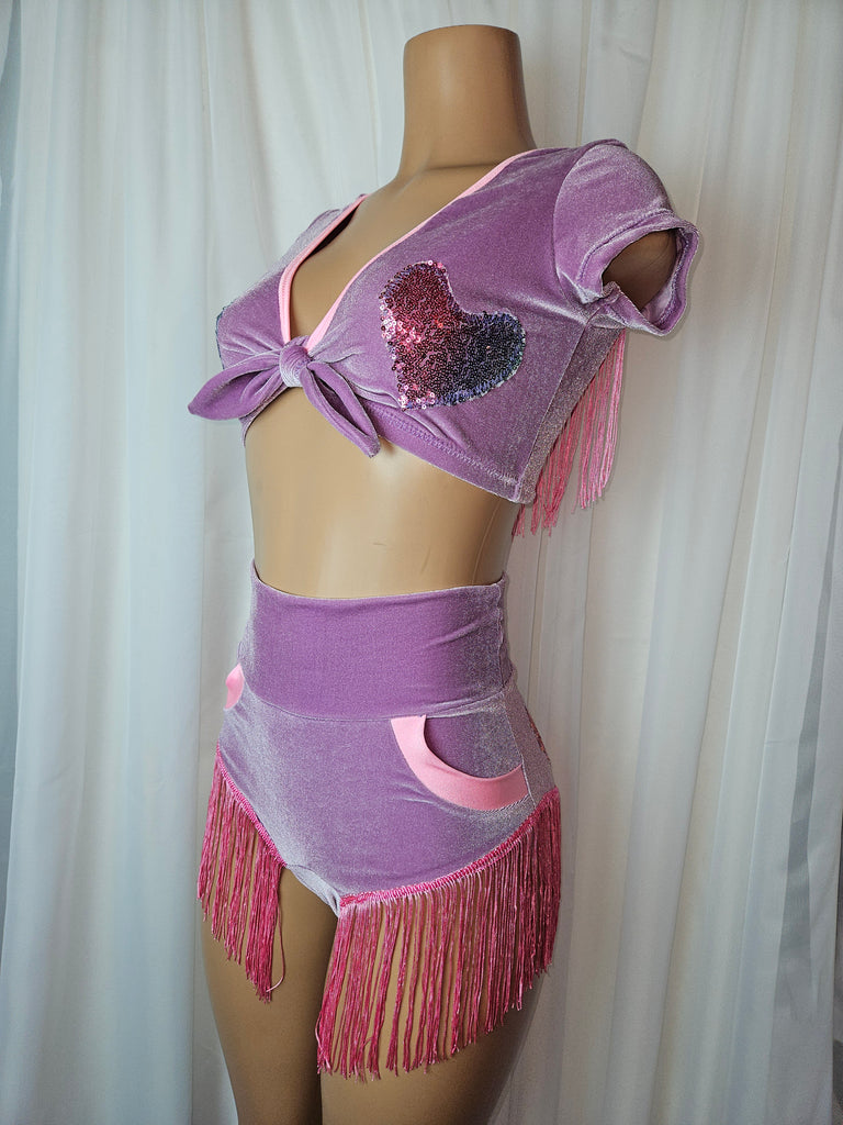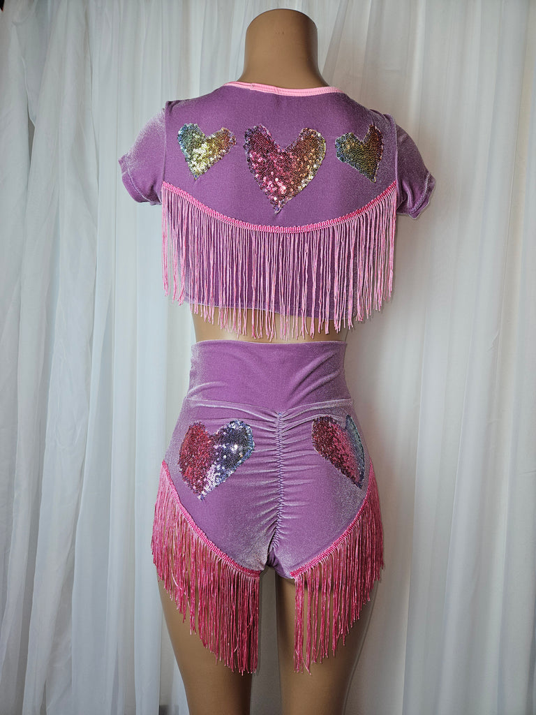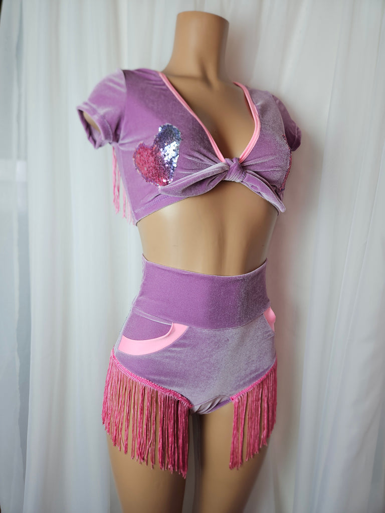 The DOLLY SHIMMY BOTTOM is an elegant and unique item, crafted with care from luxurious Violet purple stretch velvet and adorned with a cheerful pastel sequins heart appliqué and festive pink fringe. With its eye-catching design, it will add an extra sparkle to any ensemble. It also has a real pocket!!