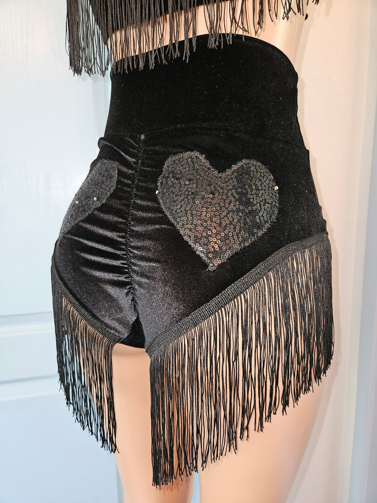 This LONELY HEARTS SHIMMY BOTTOM is an elegant and unique item, crafted with care from luxurious black stretch velvet and adorned with a cheerful black sequins heart appliqué and festive mauve fringe. With its eye-catching design, it will add an extra sparkle to any ensemble. It also has a real pocket!!