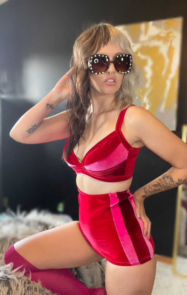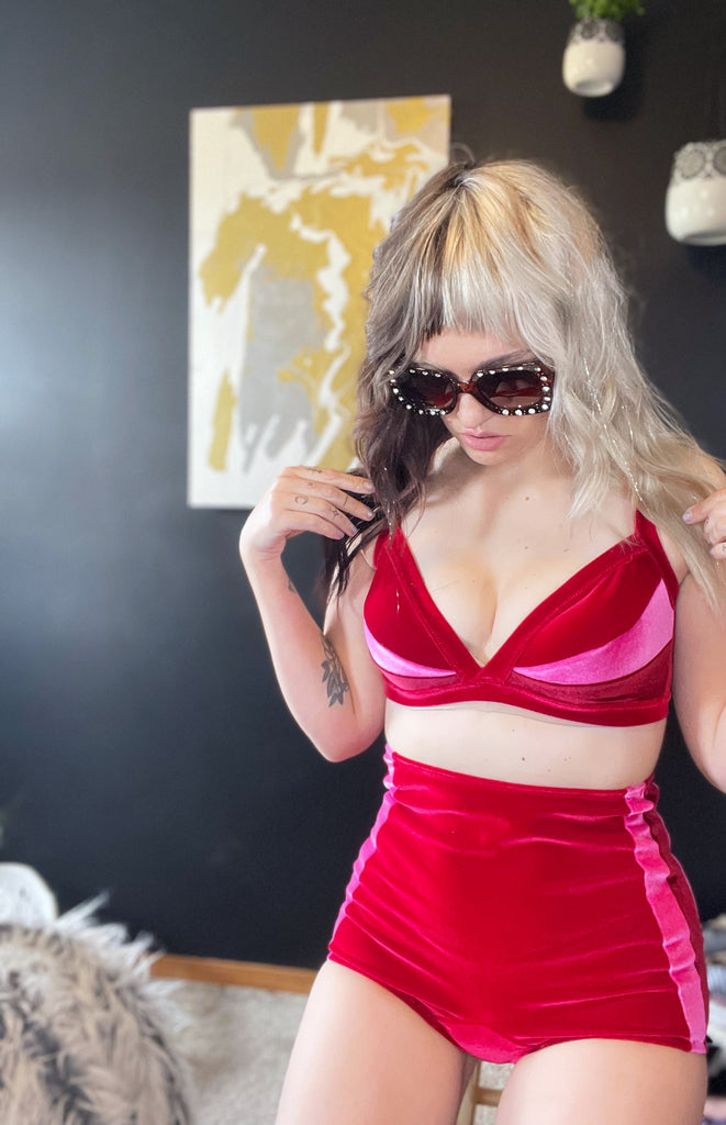 NEW!! Pink Sunset Bikini Bottom!!!! This retro inspired roller girl bikini bottom is perfect for sunny beach lounging or a dip in the pool. Handmade with maroon, red and hot pink stretch velvet with a color blocked effect. Made to order, please allow 6 weeks to process and sew your order.