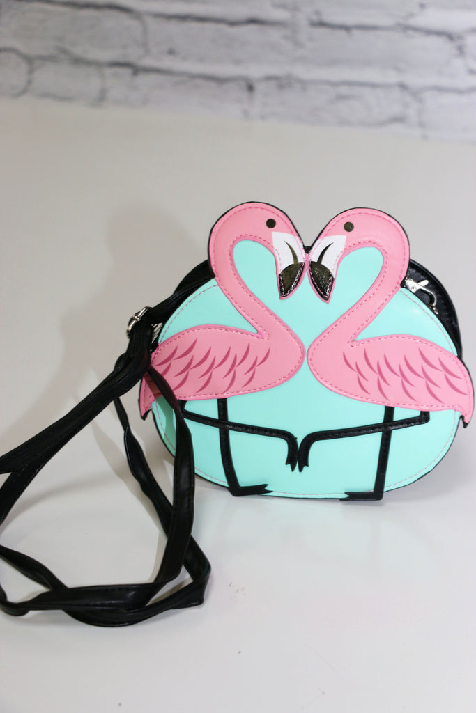 This one of a kind pink flamingo purse is exactly what you need! Featuring two pink flamingos and a mint colored background, not only does it say adorable but also practical. With plenty of room on the inside for all of your belongings and a secured shoulder strap, this purse is sure to make your heart happy.
